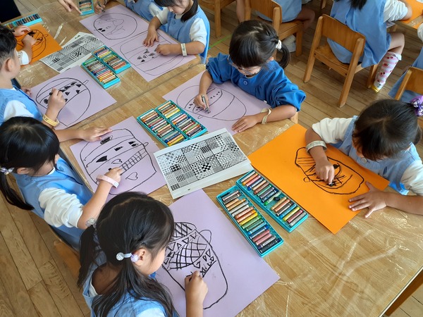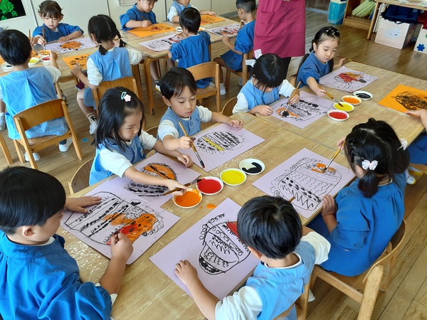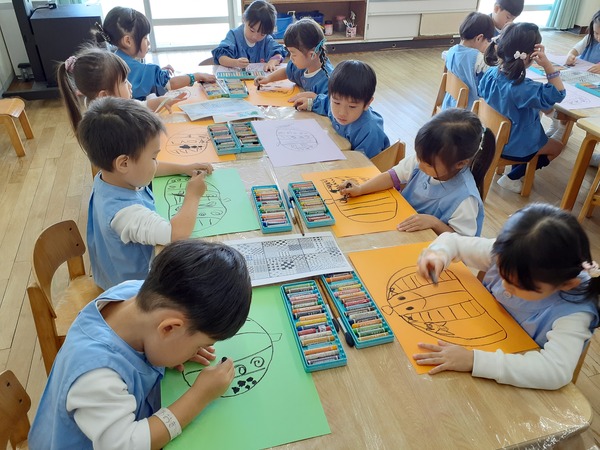 子どもたちは好きな色の画用紙を選び、クレヨンで大きなカボチャを描きました。