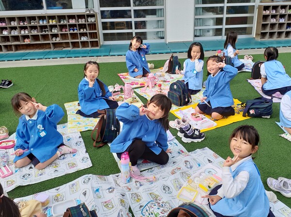 園庭にレジャーシートを広げて笑顔いっぱい☆