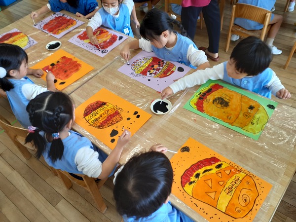 その上に水玉模様やしま模様など、思い思いの"オリジナルかぼちゃ"を完成させました。